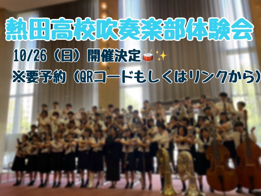 昨年度好評でした、中学生の皆さん向けの吹奏楽部体験会を今年も開催いたします!下記の詳細を確認していただき、参加申し込みをお願いいたします。 現在熱田高校吹奏楽部も1,2年生主体の新体制となり、3分