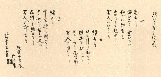一、 光あり 海広く 雲ひらけ 和やかに 朝至る あかねさす 熱田なる 若人の望みなり |