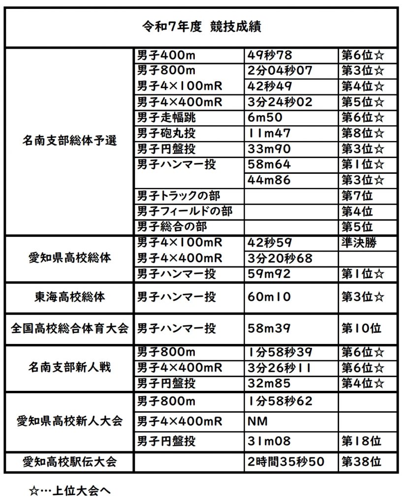 | 私たち陸上競技部は部員の約9割が競技未経験からのスタートですが、2025年は3年連続となる全国大会への出場を果たし、リレー種目だけでなく個人種目でも十数名が県大会へ出場しました。 私たち陸上競技部は部活動での様々な活動を通して、選手としてだけでなく、人として成長できるよう日々の活動に取り組んでいます。陸上競技は個人種目ではありますが、私たちは常にチームとしての「心」と「感謝」の気持ちを大切にしています。 合同練習・部活動体験・質問などのその他問い合わせは本校へご連絡ください。 インスタグラムで活動を紹介してます。 ☆Follow us!!☆ ↓ https://www.instagram.com/atsuta_tf/ |